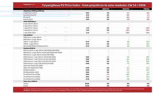 Calendar Week 10 was slightly negative for the TaiyangNews PV Price Index, with 4 listed products across 2 segments seeing single-digit-percentage declines.