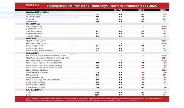 The TaiyangNews PV Price Index had an uneventful run to the End of the Year (EoY) 2025, with all product categories maintaining their price levels Week-on-Week (WoW).