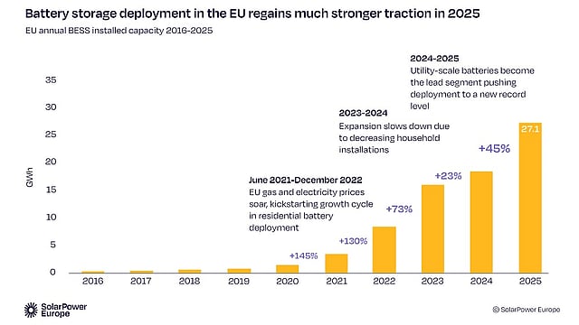 Battery storage installations in the European Union (EU) continued to grow strongly in 2025, rising 45% year-over-year (YoY) to 27.1 GWh, according to SolarPower Europe (SPE). The industry body said this was the 12th consecutive year of growth for battery storage deployment in the region.