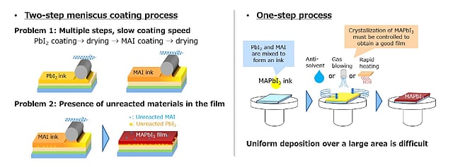 Toshiba describes that previously it used a 2-step coating process wherein it first applied a layer of Pbl2 (lead iodide) ink to a substrate, and then a layer of MAI (methyammonium iodide, CH3NH3I) ink. This triggered a reaction that formed a MAPbl3 layer. "However, this multi-step approach had a low coating rate and often left unreacted sections in the perovskite layer," stated the company.