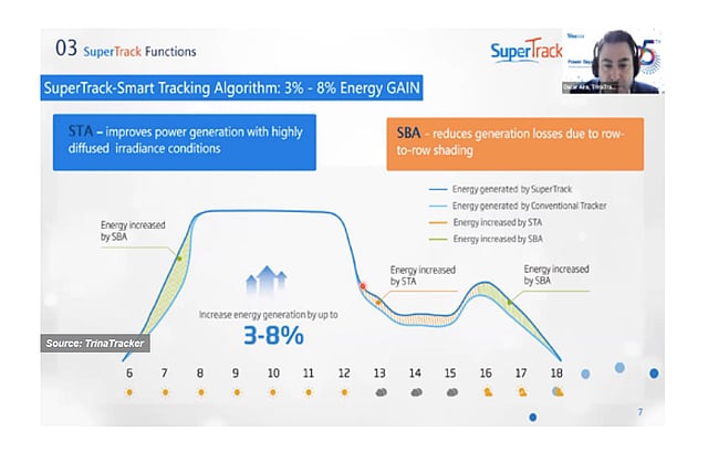It is implied that the algorithms are the heart of the innovation. The benefit with STA is that it improves power generation with highly diffused irradiance conditions, a function that is very beneficial when the plant is based on bifacial modules. Aira showed in his presentation that STA improves the energy generation, versus a conventional system, during days of higher diffused irradiation, for example during cloudy, rainy and snowy days.