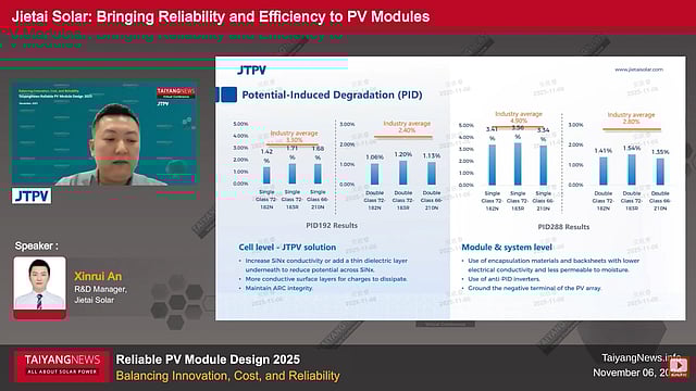 At the TaiyangNews Reliable PV Module Design 2025 Conference, Xinrui An, R&D Manager at Jietai Solar (JTPV), approached module reliability from a cell manufacturer’s perspective. Instead of focusing on module design, he walked through the main degradation mechanisms that affect today’s n-type modules. These are UV-induced degradation (UVID), damp heat (DH), and potential-induced degradation (PID). He explained how these can be addressed at the cell level.