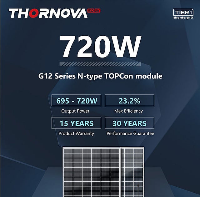 US-headquartered solar module maker, THORNOVA has launched a new high power solar module in 2 new models for the US utility scale segment, based on TOPCon solar cell technology. The new additions have a maximum power and efficiency of 720 W and 23.2%, respectively. Having started from 2022, as a relatively new entrant in PV manufacturing, THORNOVA with its headquarters in California has a 1.5 GW module fabrication unit in Vietnam, albeit procuring cells from 3rd party.