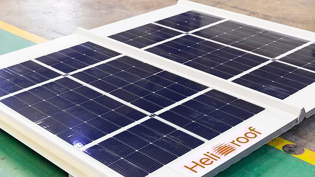 Helioroof integrates solar cells in lightweight steel sheets; the company claims these panels reduce carbon footprint by 25%