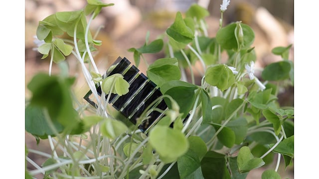 Created as part of an international green electronics research project, the compact, thin, and lightweight flexible module can be directly attached to a stem or a large leaf. It then decomposes naturally after the growing season within weeks or months. Its lifespan can be regulated by protecting the solar cell.