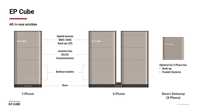 EP Cube’s 1-phase ESS combines a 7.6 kW hybrid inverter and vertically stacked 5 kWh battery modules on a single prefabricated base