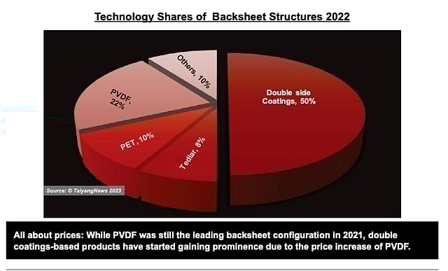 Solar backsheets are categorized according to the outer layer for the purpose of the TaiyangNews Market Survey on Backsheets and Encapsulation 2022-23. As for their market shares, the price of PVDF had started increasing already in 2021 that led to an increase in demand for coatings and PET based backsheets. While PVDF still retained its dominance that year, the fall that started then continued throughout 2022. According to our research – and as shown in the pie chart, in 2022, PVDF's share dropped to 22% while double-sided coatings gained the most from this fall, capturing a 50% share of the market. The same high price that caused PVDF's downfall also explains that of Tedlar's, which saw its market share shrink to 8%. PET claimed 10%, which is also assigned to the "others" and includes several non-fluoropolymer structures including the PP. Thereason for the considerable increase in the others category is that one leading module maker seems to have switched from a fluoropolymer to PP-based backsheets.