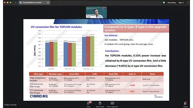 For TOPCon modules, Cybrid said its UV conversion film demonstrates up to 0.53% improvement in energy output, thus proving its ability to withstand environmental stresses.