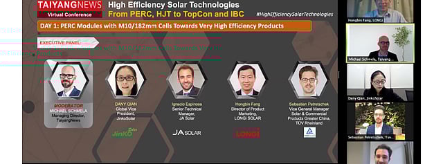 The trio once again came together along with independent testing and certification firm TUV Rheinland on day 1 of TaiyangNews' conference on December 1, 2020 specifically to discuss opportunities and challenges for the industry to further their high efficiency product of choice these days – modules based on 182mm sized wafers/cells. All of them are expanding – and all of them prioritize this new cell format for their new lines.