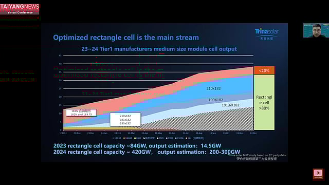 Quoting a market study report by Trina Solar, Chao Ye shared insights into the global cell capacity and estimated production figures, focusing on wafer dimensions for 2023 and 2024. The study highlighted that the major rectangular cell dimensions are 210R, 191 x 182 mm (191R), and 199 x 182 mm (199R). By the end of 2023, the global production capacity for rectangular cells was to hit 84 GW, with 14.5 GW of it reflected in actual production. Looking ahead, the capacity is projected to surge to 420 GW in 2024, accounting for over 80% of the cell market share. The production of rectangular cells is expected to range between 200 GW and 300 GW this year.