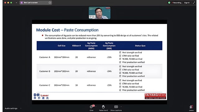 Among its other benefits is higher bifaciality, which can increase by more than 10% than reference IR soldering. Further improvement is expected. LIB-backed 0BB can also bring down silver paste consumption by more than 20%, Lee claimed, referring to the results shared by 3 of its customers.