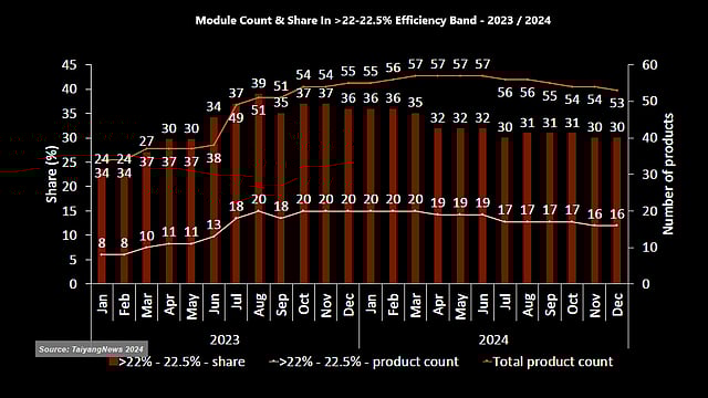 The >22% to 22.5% band grew from an 8-product share of 24% in January 2023 to 20 products and 36% by year-end, driven by TOPCon adoption