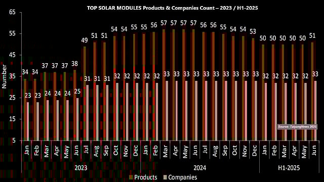 As to the product count, the number remained same from January through May 2025at 50, after a considerable drop in January due to the delisting of 3 products. The June update took the total to 51. In H2 2024, the number of listed products started decreasing, dropping to 56 in July from a peak of 57, and ultimately to 53 by December 2024. This was mainly due to a few companies ceasing their commercial activities in the PERC technology stream. A total of 5 products were delisted in H2 2024. In contrast, it was only an upward trend until then. It was in March 2024 that the peak of 57 was achieved, and continued until the end of H1 2024, increasing from the January level of 55 at the beginning of 2024.