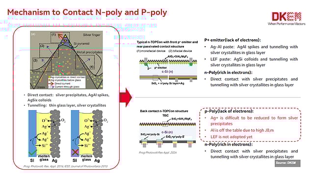 After LECO adoption, the next major efficiency gain for TOPCon cells comes from emitter optimization, particularly by eliminating the selective emitter (SE) process to reduce recombination and simplify production. One of the primary strategies involves reducing recombination at the p++ emitter region by eliminating the SE process. This not only enhances efficiency but also reduces production costs. Traditionally, silver-aluminum spikes posed a risk to shallow junctions, making SE removal impractical. However, with the LECO process and paste, contact points are sub-micron in scale, making junction depth less sensitive to damage, according to DKEM. Despite these advancements, non-SE processes initially suffered from Fill Factor (FF) losses. To counteract this, companies like DKEM have developed paste formulations, specifically optimized to enhance contact efficiency in non-SE applications. Paste suppliers have also developed products suitable for lightly doped and shallow emitters.