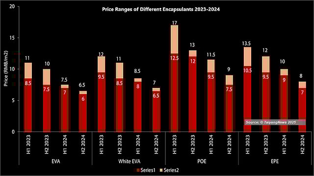 EVA, the most widely used material, saw its price fall from 11 RMB/m² in early 2023 to 6 RMB/m² by the end of 2024, with similar trends seen in POE and EPE