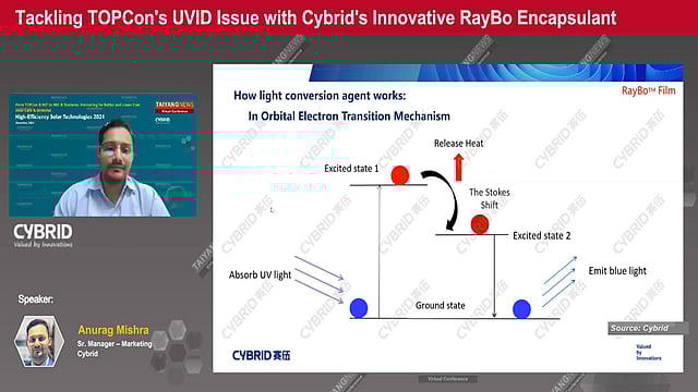 Anurag Mishra, Senior Marketing Manager at Cybrid, presented the results of stability tests during the TaiyangNews High Efficiency Solar Technologies Virtual Conference (watch presentation here). Under extensive testing, RayBo’s light conversion agent showed excellent durability even under prolonged exposure to harsh UV conditions. After simulated exposure equivalent to 50 years, only 2% of the light conversion agent is lost, ensuring that the encapsulant continues to deliver high efficiency and durability even under extreme environmental conditions. Further tests indicate that due to the proper concentration of UV conversion agents, there is nearly no decay in UV band transmission, even after exposure to 1,200 kWh/m² radiation under a 60 W/m² sun lamp.