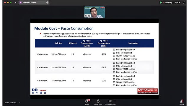 Another advanced application is Laser-Induced Bonding (LIB), which is being explored for zero-busbar BC module interconnection. While not currently relevant for TOPCon or HJT, LIB could become the standard for next-generation XBC module assembly, according to Lee.