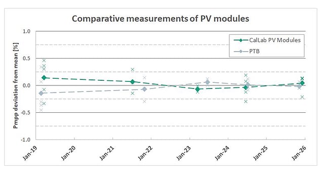 Fraunhofer ISE and PTB reported less than 0.15% difference in maximum power (Pmpp) measurements in their December 2025 interlaboratory test