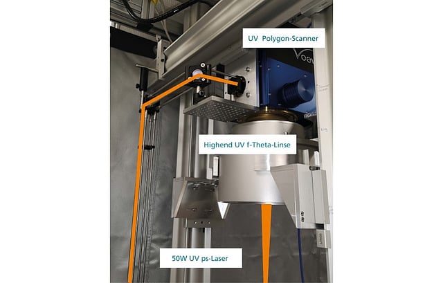 Fraunhofer says the demonstrator system's design allows very fine structures to be created on large work pieces at a very high cycle rate. It uses an ultra-fast polygon scanner for UV wavelengths, developed by its industrial partner MOEWE Optical Solutions GmbH, with a line frequency of up to 1,800 lines/second.