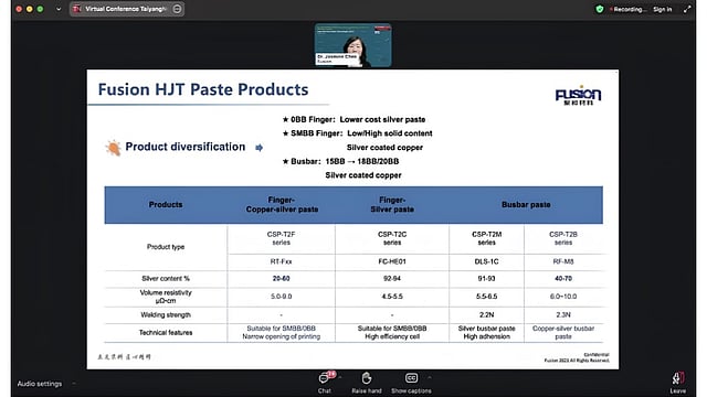 R&D Director of Fusion New Materials, a solar PV paste producer, Jasmine Chen lists cost, efficiency and reliability as the 3 primary reasons for HJT’s higher cost compared to TOPCon, something that the company says it attempts to address with its PV paste solutions. Chen was speaking on day 2 of the 4-day TaiyangNews High Efficiency Solar Technologies 2024 Conference.