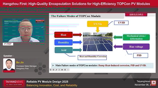 Speaking at the TaiyangNews Virtual Conference on Reliable PV Module Design, Bo Jin, Overseas Sales Manager at HANGZHOU FIRST, addressed these challenges. The presentation, titled "High-Quality Encapsulation Solutions for High-Efficiency TOPCon PV Modules", focused on how encapsulation design affects the long-term reliability of high-efficiency TOPCon modules.