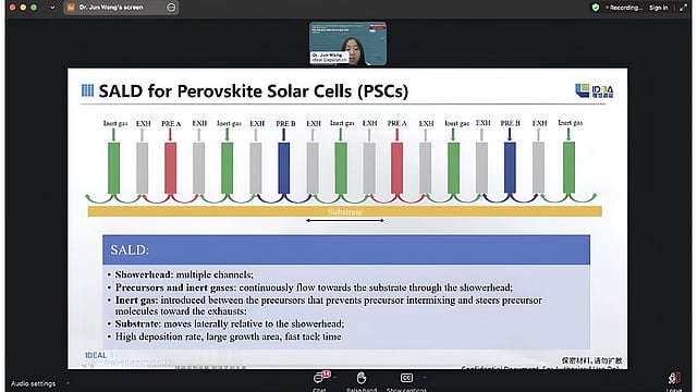 Ideal Deposition developed its deposition solutions for perovskite solar cells based on SALD, in which the 2 half reactions are not separated by time but by space, as the substrates move laterally absorbing different precursors separated by inert gas curtains. Wang claimed there is growing interest in the technology in the PSC market.