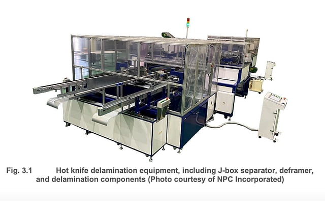 After removing the junction box, cables are removed from the separated junction box, followed by removal of the aluminum frame and then separation of the glass from the laminate backsheet, according to the report.
