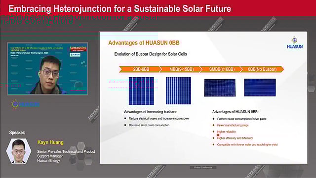 Irrespective of cell technology, the hottest topic in the module making segment is ‘zero busbars.’ In principle, the technology is applied at the cell level, but consequent changes and adaptations must be made at the module level. What it essentially means is that the cells have no busbars, meaning the interconnection wires that establish the series connection are directly attached to the finger pads. There are several advantages of ZBB: it reduces paste consumption, equipment, energy and also costs, while improving efficiency, power and reliability. Starting with equipment, it eliminates 2 screen printers from the line to apply the busbars at the front and rear. In terms of electrical gains, ZBB decreases electrical resistance within the solar cell. By eliminating the need for centralized busbars, current can be collected and transported more efficiently across a large number of fine contacts. This design reduces the distance electrons must travel, minimizing resistive losses and enabling a more efficient flow of electrical charge. This helps in increasing efficiency. Huasun also showed that the ZBB technology improves reliability by reducing the occurrence of hot spots. It also brings in optical gains; the metal shadowing area on a ZBB module is about 16% less on the front and 27% on the rear, which increases the open area for sunlight absorption, according to Huasun. The latter also helps increase bifaciality (see Module Design Strategies For Back Contact Integration).