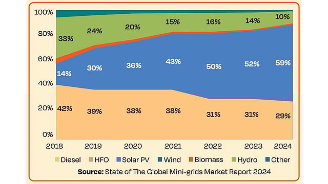 The growing viability and adoption of solar are bringing down the use of harmful diesel in mini-grid installations. Its share came down from 31% in 2023 to 29% in 2024.