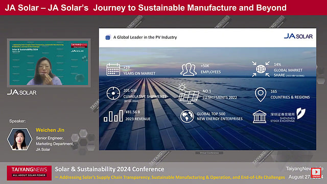 At the TaiyangNews Solar & Sustainability 2024 Virtual Conference, Weichen Jin, Senior Engineer in the marketing department at JA Solar, shared its journey and roadmap to sustainable manufacturing (see JA Solar presentation here). With over 19 years in the market and manufacturing facilities in China, Vietnam, and the USA, JA Solar achieved cumulative global PV module shipments of 201 GW by Q1 2024.