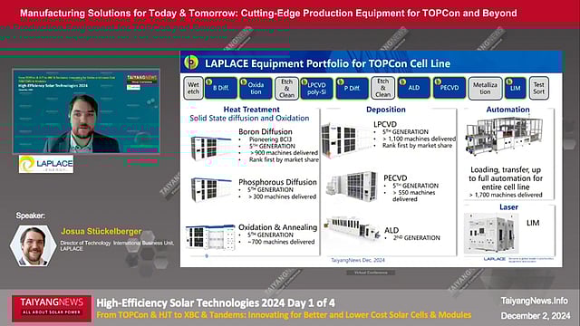 LAPLACE, a well-established supplier of thermal processing equipment for the PV industry, offers its LPCVD platform for high-efficiency TOPCon solar cell manufacturing. LLP480/6 is an LPCVD system designed for tunnel oxide and in-situ doped polysilicon deposition in TOPCon solar cell production. Available since 2022, the tool supports wafer sizes from 182 mm to 210 mm and thicknesses above 120 μm. It features a 6-chamber batch configuration with automatic carrier-based wafer handling, supporting both horizontal and vertical wafer orientations.