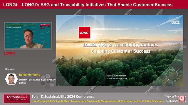 In this context, at the TaiyangNews Solar & Sustainability 2024 Conference, Benjamin Wong, Director of Public Affairs and Sustainability at LONGi, shared a brief overview of the company's latest ESG & Traceability initiatives, aligning with EU ESG reporting obligations and regulations (see LONGi presentation here).