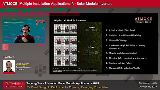 Solar Inverter architectures are increasingly being evaluated not only on efficiency, but also on safety, flexibility, and system-level resilience. During the recent TaiyangNews Advanced Solar Module Applications 2025 Conference, ATMOCE presented a comprehensive strategy for these emerging segments. In a presentation titled ‘Multiple Applications for Solar Module Inverters’ Alec Curry, Product Manager for the DACH region at ATMOCE, discussed how module inverters enable a wide range of installation applications by shifting power conversion from the string level to the panel level.