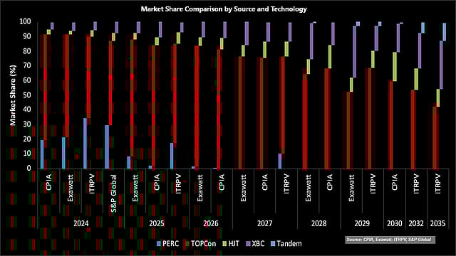 Back-contact (XBC) technologies are gaining ground, with forecasts showing potential to overtake HJT and reach up to 35% market share by 2029
