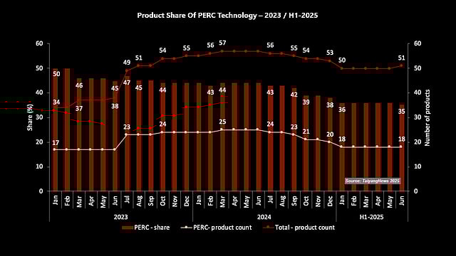 In H1 2025, the number of PERC modules dropped from 20 in January to 18 by March, and their share reduced from 38% to 35%
