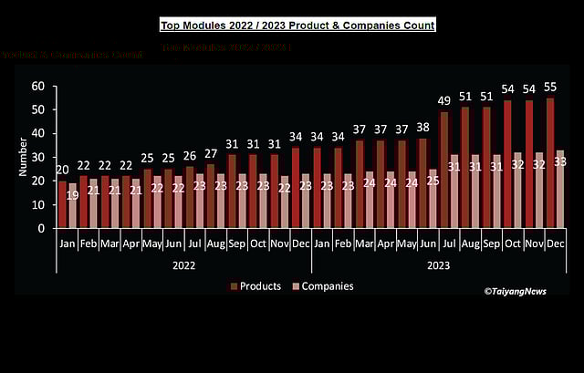 There has been an increased emphasis on efficiency in general, as is evident from the number of commercially-available products listed in the TOP MODULES section that meet the minimum efficiency criterion of 21.5%. From 20 in January 2022, this number increased consistently to 34 by December 2022. For the year 2023, the number of products continued to increase within the first half, to 38 in June and to 55 by December. The number of companies offering such products also increased from 19 to 23 over the course of 2022, to 25 by H1-2023, and then to 33 as of the end of 2023.