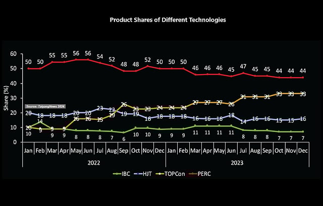 Starting with statistics, the chart above summarizes the cell technology distribution among the top module products listed each month. Except for TOPCon, all the technologies have lost share over the course of 24 months, while the absolute product count did increase for all technologies but for PERC. IBC technology witnessed a gradual decline, slipping from 10% to 9% in 2022, and further decreasing to 7% by the end of 2023. Similarly, HJT, which started with a 20% share in 2022, saw a decline to 16% by the close of 2023. In contrast, TOPCon surged ahead significantly, with its market share leaping from 10% to an impressive 33% over the same period. Despite its enduring prominence, PERC experienced a dip in its market share from 50% to 44%.