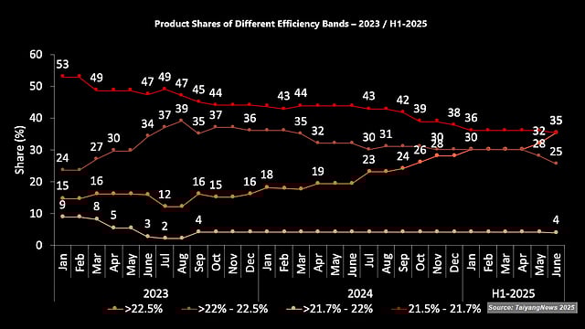 The 21.5% to 21.7% band, consisting mainly of PERC modules, dropped from 53% in January 2023 to 35% in June 2025, reflecting the shift toward advanced architectures