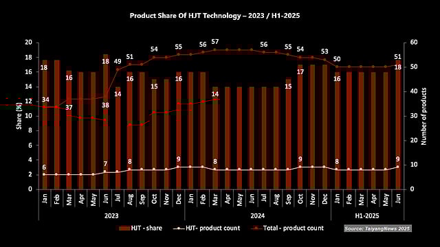 In the first half of 2025, HJT maintained a stable product count of 8 from January till May, corresponding to a steady 16% share. In June, the count rose to 9 with the entry of Jetion Solar, whose HJT module debut pushed the segment’s share to 18%. Earlier, in January, HJT’s share had declined from 17% to 16%, following the delisting of Akcome’s HJT module. Although the total number of listed modules dropped from 53 to 50 that month, the magnitude of Akcome’s exit was higher in terms of HJT's share percentage, with the count reducing from 9 to 8.