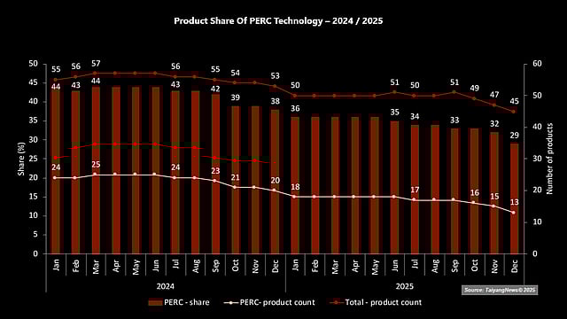 The downward trend continued in November 2025, with the delisting of DAS Solar’s PERC module, reducing the number of products to 15 and the share to 32%. The most pronounced contraction occurred in December, with the removal of 2 additional PERC modules, one each from Canadian Solar and GCL SI. As a result, the year ended with 13 PERC products, representing a 29% share (see Product Shares Of Different Cell Technologies).