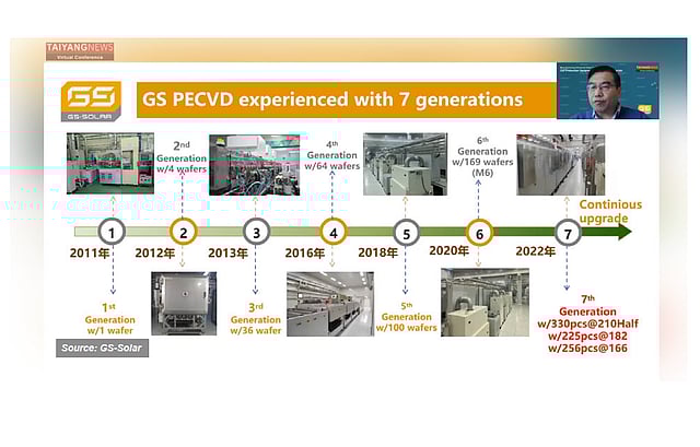 The most important development in the field of core layer deposition is the introduction of a microcrystalline silicon layer into the HJT structure. Implementing microcrystalline in the industry only refers to replacing the doped amorphous silicon layers, while the very thin intrinsic amorphous silicon films of 1 to 2 nm attached to the wafer surface remain the same. The primary advantage of using n-type microcrystalline silicon on the emitter side is that it can improve the current (Isc) and fill factor (FF). The increase in Isc is due to the fact that the light absorption coefficient of the microcrystalline silicon is far less than amorphous silicon. HJT devices that use microcrystalline silicon exhibit superior short and long wavelength responses. Risen says it will also introduce oxygen or carbon to increase the band gap within the microcrystalline layer for better short wavelength responses. The increase in FF is mainly due to the superior conductivity of the microcrystalline film, which decreases the silver resistance of cells and reduces the dependence on ITO for conductivity. The industry is also evaluating replacing p-type amorphous silicon with microcrystalline silicon on the rear side as the next step of improvement. Using a microcrystalline doped layer on both sides leads to high field effect passivation. The industry is colloquially referring to the amorphous silicon on both sides as HJT1.0, microcrystalline on the emitter side as HJT2.0, and double-sided microcrystalline as HJT3.0. At TaiyangNews' recent Solar Cell Production Equipment & Processing Materials conference (end-February), Jinyan Zhang, the GM at R&D department for GS-Solar, gave an insightful presentation on their specific PECVD solution for depositing microcrystalline silicon, titled Development of Micro-Crystalline HJT Solar Cells using 13.56MHz RF Mass Production Equipment (see recording here). Zhang emphasized that the 13.56MHz RF technology is ideal for large chamber PECVD equipment used in mass production of microcrystalline HJT cells, citing benefits such as good uniformity of the deposited films, a relatively wider and tolerant process window, and no plasma damage. He also presented raw production data that showed significant efficiency gains; a 0.5% efficiency gain with n-type microcrystalline silicon on emitter leading to an absolute efficiency of 24.47% and a further 0.4% gain by using the microcrystalline films on both sides that led to the efficiency of 25.45%. GS-Solar's latest 7th generation PECVD reactor has a capacity of 800 MW to 1 GW per single tool, and is capable of processing 330 half pieces of G12 wafers, a significant improvement over the previous generation tool's ability to process only 169 M6 wafers.