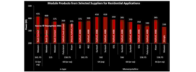 Within the n-type segment, the largest wafer size is M4, while Maxeon is still offering panels based on the smaller 125 mm wafers. M6 and G1 are the main formats seen among monocrystalline panels. Last but not the least, pleasing aesthetics are a huge plus in residential applications. A simple way to achieve this is by employing a black backsheet that significantly improves the module's appearance. A total of 5 such panels are featured in the current listing from Maxeon, REC and Suntech. This also explains why there is a double listing of products under these companies, although they belong to the same technology streams. However, having a black rear cover eliminates the coupling gains from the cell spacing that often leads to lower power rating. Maxeon's IBC based product has the highest loss of 25 W compared to the white background variant, while the products from REC and Suntech lose one wattage class of 5 W with a black backsheet. On the other hand, Suntech apparently managed to have no such losses with its Ultra V mini series, with both the variants rated at 410 W.
