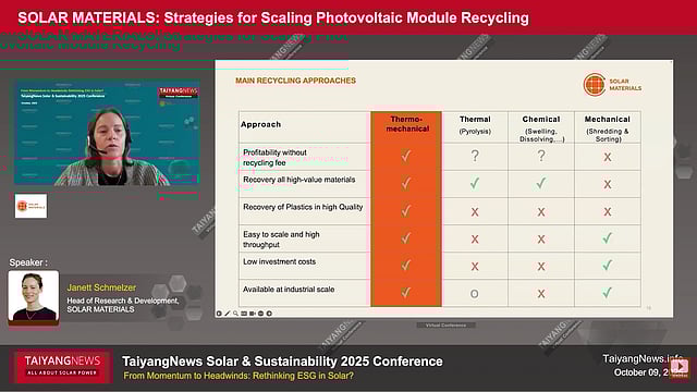 As the early utility and rooftop installations approach the end of their operating life, recycling volumes are set to rise sharply. Sustainability discussions also often focus on the end-of-life management of PV modules. At the TaiyangNews Solar & Sustainability conference 2025, Janett Schmelzer, Head of R&D at Solar Materials, spoke about the emerging challenge of PV module recycling and how the industry is preparing for the first large wave of decommissioned solar panels.
