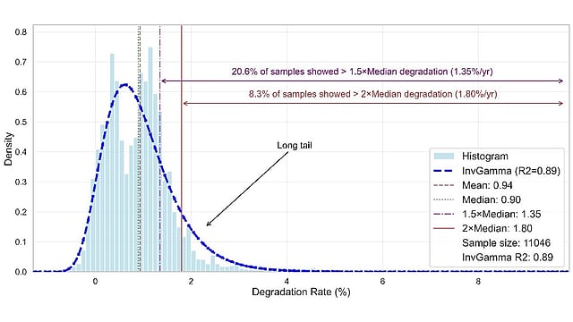 “For the entire dataset, we observed that system performance typically declines by around 0.9% per year. However, our findings show extreme degradation rates in some of the systems,” said one of the team members and authors of the study, Yang Tang. “At least one in five systems degrade at least 1.5 times faster than this typical rate, and roughly one in 12 degrade twice as fast.”