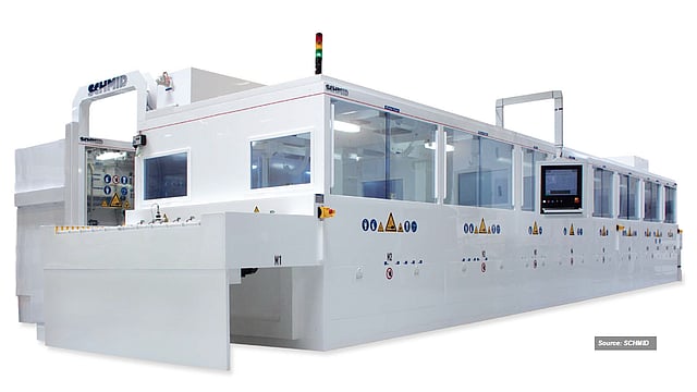 The TOPCon cell manufacturing process involves 3 wet chemical steps, starting with texturing and cleaning. This stage removes saw damage while also conducting surface texturing and cleaning. Typically, the SDE and texturing processes are carried out in batch systems; however, SCHMID, a long-standing German supplier of wet benches, offers inline solutions.