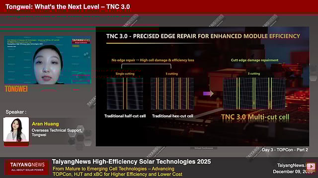 During the TaiyangNews High-Efficiency Solar Technologies Conference 2025, Aran Huang, Overseas Technical Support Manager at Tongwei, presented the company’s perspective on the next phase of TOPCon development. The presentation, titled What’s the Next Level – TNC 3.0, introduced the company’s module platform, designed to increase module power while improving operational performance under real-world conditions.