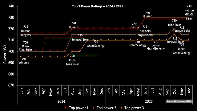 The highest rated module power reached 730 W in June 2025 and remained unchanged through December, a 15 W increase over the last 2 years