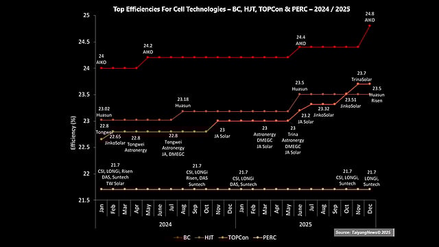 Over the last 24 months, the top BC efficiency increased by 0.8% in absolute terms, reaching 24.8% by December 2025