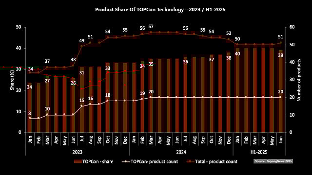In H1 2025, TOPCon listed 20 products each month, representing 40% share through May and 39% in June