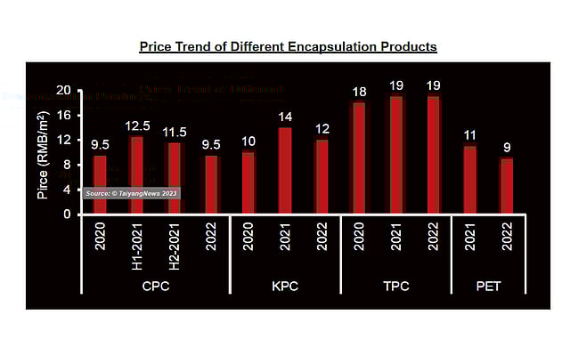 Encapsulation Material Price Development If there is anything beyond cell technologies in the encapsulation segment, that's price, and in a good way. The price for EVA resin has fallen considerably from an all-time high of 300,000 RMB/ton in 2021 to 15,000 to 20,000 RMB/ton, and this downtrend is expected to continue further. While we do not have a reference, the price of the POE resin was around 330,000 RMB/ton during the end of 2022, according to Cybrid's International Marketing Director Eric Yang. Overall, the prices of encapsulation materials have dropped compared to H1 2021. As can be seen from the graph, the prices for all varieties of encapsulation materials are back to their 2020 levels. A note here that while the prices of 2020 and H1 2021 are taken from the previous edition of our survey, the H2 2021 and H2 2022 prices are from a partner who wants to stay anonymous, and thus the source remains unidentified. As a consequence, these prices may not be accurate, but can serve as reference.